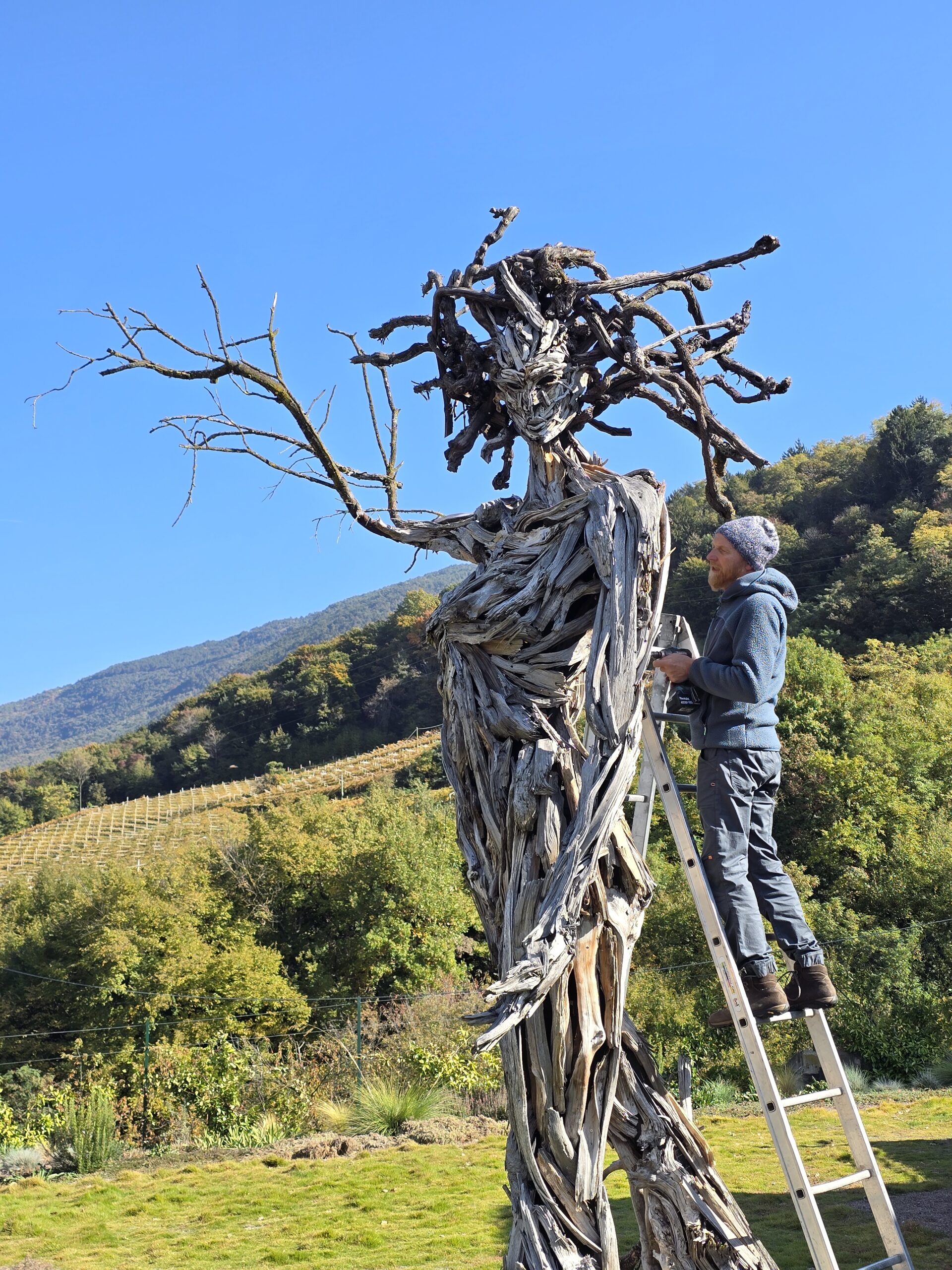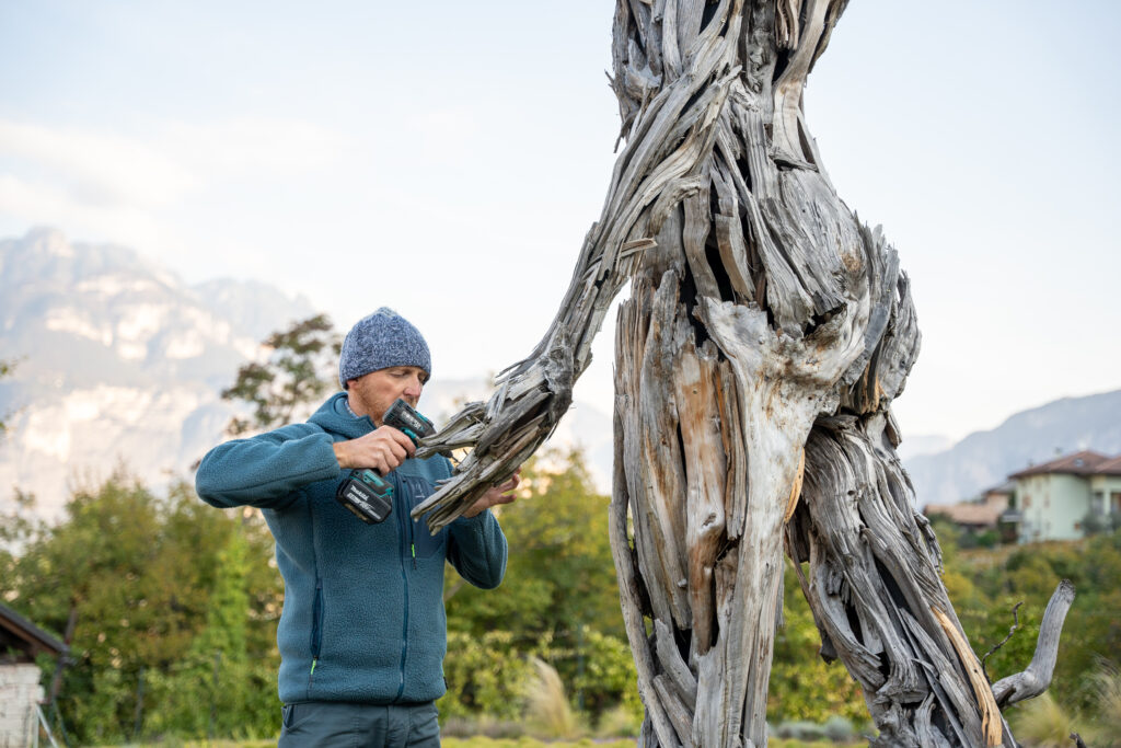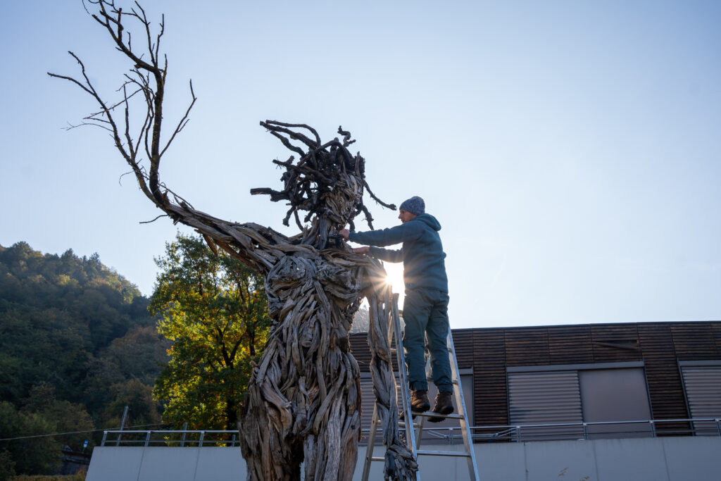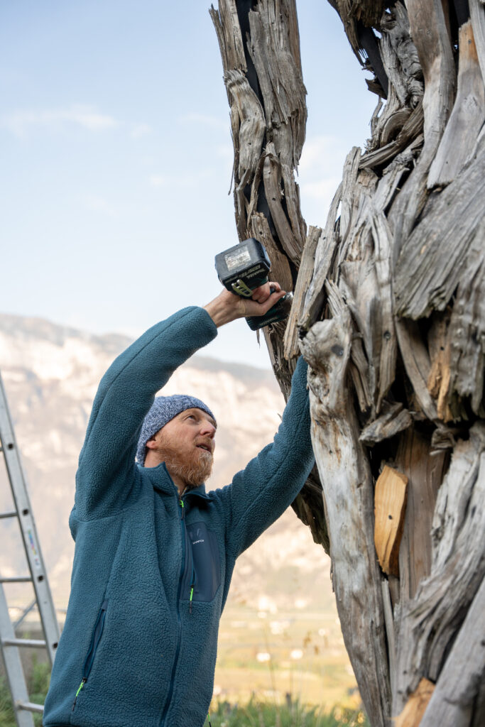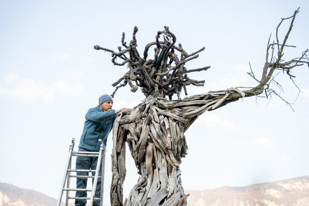 scultore all’opera sulla statua “Terra e Cielo”